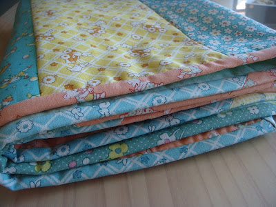 Снова швейное :-) У нас на работе сразу несколько девочек-хирургических медсестер беременны и скоро мы будем их одаривать подарками - обычно собирается гигантская корзина, доверху заполненная всякими нужными вещами. Для двоих из них я решила сделать индивидуальные подарки, заодно убив двух зайцев - потренироваться шить квилты :-) В этот раз я попробовала способ "quilt as you go", потому что он обещал быстрый результат, и это оказалось сущей правдой - за день с перерывами на обед, поход в магазин и т.п. небольшое одеяльце было готово. Было бы и быстрее, если бы использовала полоски в ширину ткани, как в этом уроке, но у меня были четвертинки (fat quarters), которые пришлось резать и сшивать. Большинство тканей из коллекции Once Upon a Storybook by WIndham Studios, это репродукция тканей 1930х, очень мне нравится. Прокладка - хлопок, подкладка - фланелька мятного цвета :-) Способ и правда быстрый, очень удобно. Одеяльце получилось мягкое, славное такое :-) Размер - 80 на 95см.